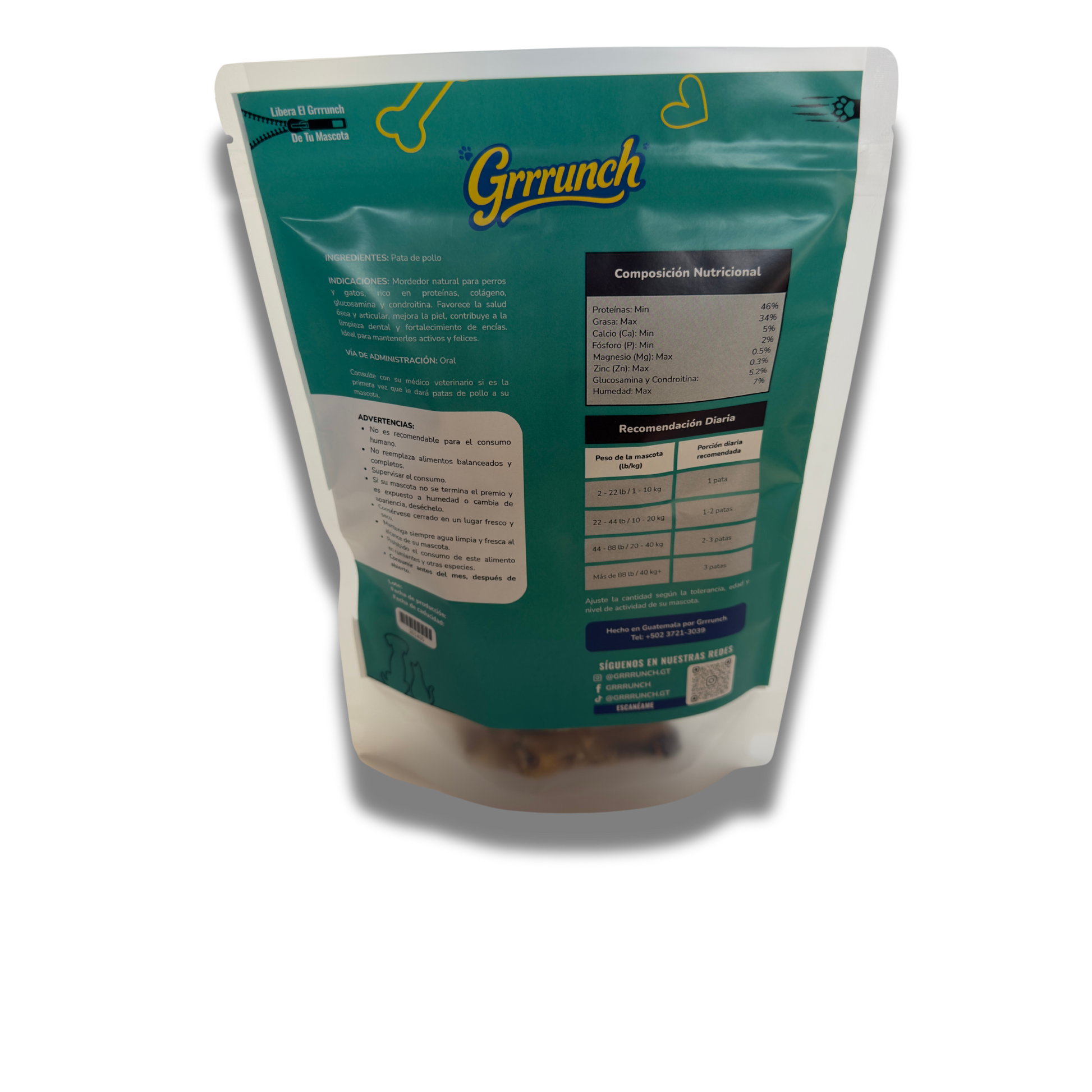El Kikirikí de Grrrunch es un mordedor 100% natural elaborado con patas de pollo deshidratadas, ideales para perros y gatos. Este snack combina sabor, salud y diversión, ayudando de forma natural a mantener la limpieza dental y fortalecer las encías gracias a su textura crujiente.